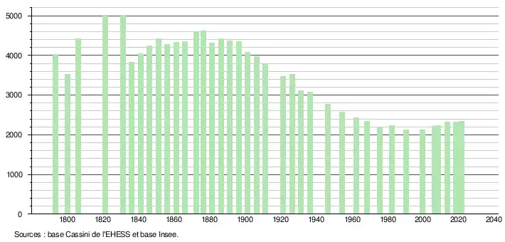 L'évolution du nombre d'habitants est connue à travers les recensements de la population effectués dans la commune depuis 1793. Pour les communes de moins de 10 000 habitants, une enquête de recensement portant sur toute la population est réalisée tous les cinq ans, les populations légales des années intermédiaires étant quant à elles estimées par interpolation ou extrapolation[27]. Pour la commune, le premier recensement exhaustif entrant dans le cadre du nouveau dispositif a été réalisé en 2008[28].