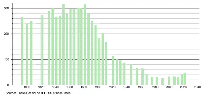 L'évolution du nombre d'habitants est connue à travers les recensements de la population effectués dans la commune depuis 1793. Pour les communes de moins de 10 000 habitants, une enquête de recensement portant sur toute la population est réalisée tous les cinq ans, les populations légales des années intermédiaires étant quant à elles estimées par interpolation ou extrapolation[17]. Pour la commune, le premier recensement exhaustif entrant dans le cadre du nouveau dispositif a été réalisé en 2007[18].