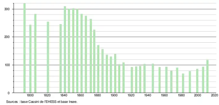 - Dans le tableau des recensements et le graphique, par convention dans Wikipédia, le principe a été retenu, pour les populations légales postérieures à 1999 de n’afficher dans le tableau des recensements et le graphique que les populations correspondant à l'année 2006, première population légale publiée calculée conformément aux concepts définis dans le décret no 2003-485 du 5 juin 2003, et les années correspondant à une enquête exhaustive de recensement pour les communes de moins de 10 000 habitants, ainsi que la dernière population légale publiée par l’Insee.