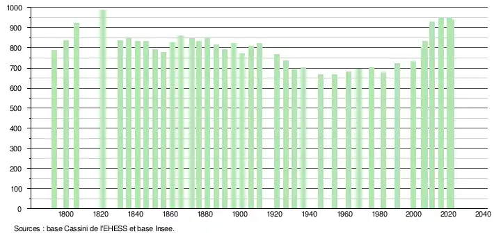 L'évolution du nombre d'habitants est connue à travers les recensements de la population effectués dans la commune depuis 1793. Pour les communes de moins de 10 000 habitants, une enquête de recensement portant sur toute la population est réalisée tous les cinq ans, les populations légales des années intermédiaires étant quant à elles estimées par interpolation ou extrapolation[29]. Pour la commune, le premier recensement exhaustif entrant dans le cadre du nouveau dispositif a été réalisé en 2005[30].