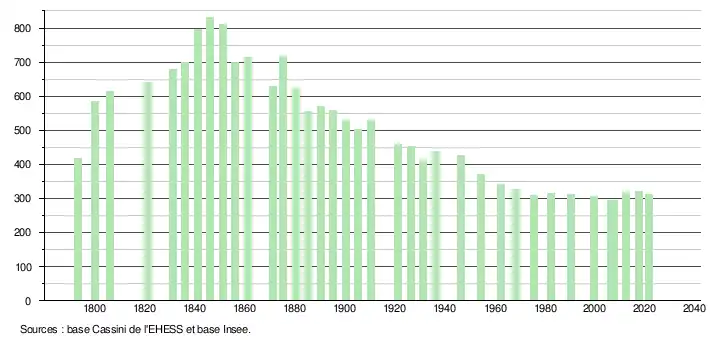 L'évolution du nombre d'habitants est connue à travers les recensements de la population effectués dans la commune depuis 1793. Pour les communes de moins de 10 000 habitants, une enquête de recensement portant sur toute la population est réalisée tous les cinq ans, les populations légales des années intermédiaires étant quant à elles estimées par interpolation ou extrapolation[21]. Pour la commune, le premier recensement exhaustif entrant dans le cadre du nouveau dispositif a été réalisé en 2007[22].