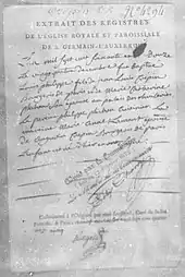 - Les registres paroissiaux et d'état civil à Paris antérieurs à 1860 ont été détruits lors des incendies de la Commune de Paris mais un extrait de baptême a pu servir pour reconstituer l'acte aux archives de Paris. Extrait des registres de l'église Saint-Germain-l'Auxerrois de Paris : « L'an mil sept cent soixante douze le vingt quatre décembre fut baptisé Louis Philippe, fils de Jean Louis Crépin, bourgeois de Paris, et de Marie Catherine Plichon, son épouse, au palais des Tuileries. Le parrain Philippe Plichon, cuisinier. La marraine Marie Anne Laurent, épouse de Augustin Crépin, bourgeois de Paris. L'enfant est né d'hier. Et ont signé. »