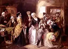 Les docteurs Lassone et Moreau avancent néanmoins plusieurs raisons à ce retard conjugal, le premier parlant d'une « timidité naturelle » du monarque et le second d'un corps fragile qui semble néanmoins « prendre plus de consistance »[37]. D'autres auteurs, comme le biographe Bernard Vincent[38], dénoncent quant à eux les coutumes de la cour qui, ajoutées à la timidité du roi et à la fragilité de son corps, ne pouvaient que retarder le moment suprême. En effet, les époux vivent dans des appartements séparés, et seul le roi a le droit de rendre visite à son épouse quand il s'agit de remplir le devoir conjugal. Une fois devenu roi, Louis XVI vit dans des appartements encore plus éloignés de ceux de sa femme qu'auparavant, et les allées et venues vers son épouse se font toujours sous le regard de courtisans curieux, notamment par la traversée du salon de l'Œil-de-bœuf. L'auteur ajoute que l'éducation prude et pudibonde des deux jeunes époux, au moment où ils étaient éduqués chacun dans leur pays, ne les avait pas disposés à s'abandonner du jour au lendemain aux audaces des relations conjugales. Car les adolescents, en étant tenus de passer leur première nuit ensemble[alpha 7], furent subitement confrontés à la vie adulte sans y avoir été préalablement préparés. Et ni leur éducation, ni leur corps à peine pubère ne pouvaient les aider à surmonter cette étape. Peu sûr de lui et peu romantique, Louis XVI trouvera refuge dans l'une de ses activités préférées : la chasse.