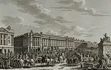 Marie-Antoinette part pour la France le au cours d'un voyage qui durera plus de 20 jours accompagnée d'un cortège d'une quarantaine de véhicules[33]. Le cortège arrive à Strasbourg le . La cérémonie de « remise de l'épouse » s'effectuera au milieu du Rhin, à égale distance entre les deux rives, sur l'Île aux Épis. Dans un pavillon construit sur cet îlot, la jeune femme troque ses vêtements autrichiens pour des vêtements français, avant de ressortir outre-Rhin, vers un cortège français et à côté de la comtesse de Noailles, sa nouvelle dame d'honneur[34]. La rencontre entre le dauphin et sa future épouse a lieu le , au pont de Berne, dans la forêt de Compiègne. Le roi, le dauphin et la cour sont là pour accueillir le cortège. À sa descente du carrosse, la future dauphine fait la révérence au roi et est présentée par lui au duc de Berry, lequel lui fait un discret baiser sur la joue. Le carrosse royal emmène ensuite le roi, le dauphin et sa future épouse au château de Compiègne, où une réception officielle est organisée le soir même pour présenter la future dauphine aux principaux membres de la cour. Le lendemain, le cortège s'arrête au carmel de Saint-Denis où Madame Louise s'est retirée depuis quelques mois, puis il se rend au château de la Muette pour présenter sa future épouse au comte de Provence et au comte d'Artois, et où elle fait connaissance avec la nouvelle et dernière favorite du roi, la comtesse du Barry.