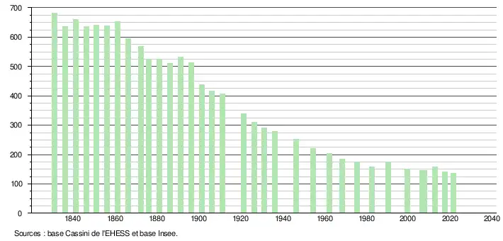 - Population municipale légale en vigueur au 1er janvier 2024, millésimée 2021, définie dans les limites territoriales en vigueur au 1er janvier 2023, date de référence statistique : 1er janvier 2021.
