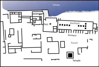 Le forum de Lousonna n'était pas situé au centre de l'agglomération mais à l'est de celle-ci, sur une position un peu plus élevée, à une altitude variant entre 100 et 150 mètres[3]. Il est bordé au sud par la basilique, située au bord du lac[12],[7]. C'est le bâtiment le plus important du site. Sa fonction principale était probablement celle d'une salle de réunion du conseil municipal, qui, comme dans toutes les cités du territoire helvète, dépendait de la colonie d'Aventicum (Avenches). La basilique devait aussi servir de tribunal et de centre d'échange. Adossées à celle-ci, on trouve des boutiques, et des tabernae. L'une de ces tabernae a fait l'objet d'un remaniement pour devenir une schola[15]. Les ruines de ce bâtiment à vocation collégiale, ont été exhumées lors de prospections archéologiques. Par ailleurs, cette schola a été identifiée comme appartenant aux nautae de l'ancienne cité lausannienne, une confrérie corporative constituée de riches bateliers gallo-romains[3],,[7]. Une inscription épigraphique, sous forme de dédicace, a été retrouvée au cours des sondages. Ce texte (« numinibus Aug(austurum) ») rédigé en latin, est gravé sur un bloc de pierre de 185 centimètres de long, pour 55 de large. L'inscription témoigne du statut de la schola comme lieu de réunion des nautae de Lousonna. Au centre de la place, une area publica dont la destination est essentiellement commerciale, le temple carré de type gallo-romain, est édifié plus tardivement au milieu du IIIe siècle[12],[16]. Il est voué au culte de Rome et de l'Empereur, comme l'attestent les fragments d'une frise trouvé à proximité[17],[3].