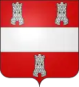 Blasonnement : De gueules à une fasce d'argent accompagnée de trois tours du même maçonnées de sable.