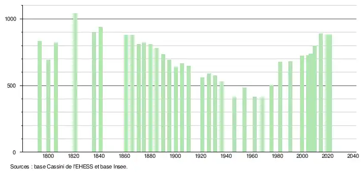 L'évolution du nombre d'habitants est connue à travers les recensements de la population effectués dans la commune depuis 1793. Pour les communes de moins de 10 000 habitants, une enquête de recensement portant sur toute la population est réalisée tous les cinq ans, les populations légales des années intermédiaires étant quant à elles estimées par interpolation ou extrapolation[18]. Pour la commune, le premier recensement exhaustif entrant dans le cadre du nouveau dispositif a été réalisé en 2004[19].