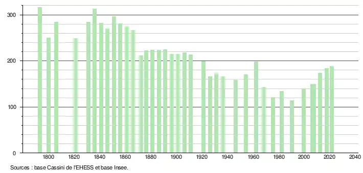 L'évolution du nombre d'habitants est connue à travers les recensements de la population effectués dans la commune depuis 1793. Pour les communes de moins de 10 000 habitants, une enquête de recensement portant sur toute la population est réalisée tous les cinq ans, les populations légales des années intermédiaires étant quant à elles estimées par interpolation ou extrapolation[20]. Pour la commune, le premier recensement exhaustif entrant dans le cadre du nouveau dispositif a été réalisé en 2007[21].