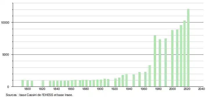 - Par convention dans Wikipédia, le principe a été retenu de n’afficher dans le tableau des recensements et le graphique, pour les populations légales postérieures à 1999, que les populations correspondant à une enquête exhaustive de recensement pour les communes de moins de 10 000 habitants, et que les populations des années 2006, 2011, 2016, etc. pour les communes de plus de 10 000 habitants, ainsi que la dernière population légale publiée par l’Insee pour l'ensemble des communes.