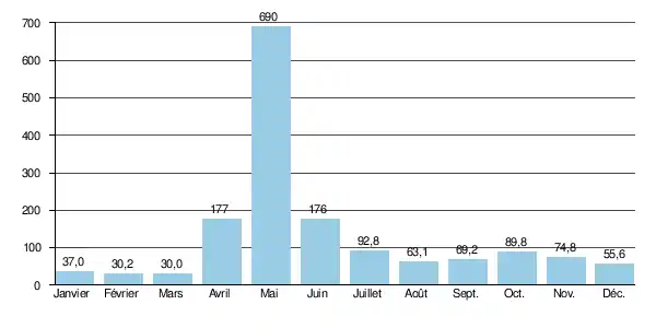 Le débit moyen mensuel observé en mars (minimum d'étiage) est de 30,0 m3/s, soit plus ou moins 4,5 % du débit moyen du mois de mai (690 m3/s), ce qui témoigne de variations saisonnières élevées. Sur la durée d'observation de 45 ans, le débit mensuel minimal a été de 11,3 m3/s en , tandis que le débit mensuel maximal atteignait 1 270 m3/s en .