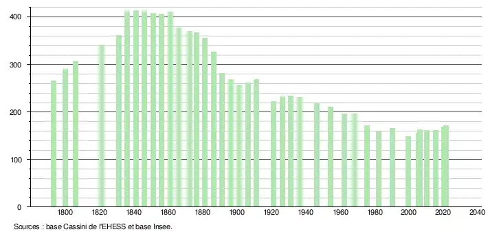 L'évolution du nombre d'habitants est connue à travers les recensements de la population effectués dans la commune depuis 1793. Pour les communes de moins de 10 000 habitants, une enquête de recensement portant sur toute la population est réalisée tous les cinq ans, les populations légales des années intermédiaires étant quant à elles estimées par interpolation ou extrapolation[16]. Pour la commune, le premier recensement exhaustif entrant dans le cadre du nouveau dispositif a été réalisé en 2005[17].