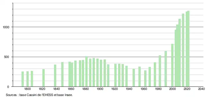 L'évolution du nombre d'habitants est connue à travers les recensements de la population effectués dans la commune depuis 1793. Pour les communes de moins de 10 000 habitants, une enquête de recensement portant sur toute la population est réalisée tous les cinq ans, les populations légales des années intermédiaires étant quant à elles estimées par interpolation ou extrapolation[20]. Pour la commune, le premier recensement exhaustif entrant dans le cadre du nouveau dispositif a été réalisé en 2004[21].