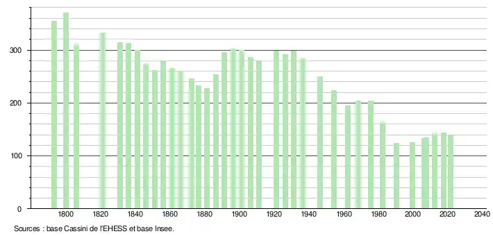 L'évolution du nombre d'habitants est connue à travers les recensements de la population effectués dans la commune depuis 1793. Pour les communes de moins de 10 000 habitants, une enquête de recensement portant sur toute la population est réalisée tous les cinq ans, les populations légales des années intermédiaires étant quant à elles estimées par interpolation ou extrapolation[28]. Pour la commune, le premier recensement exhaustif entrant dans le cadre du nouveau dispositif a été réalisé en 2007[29].