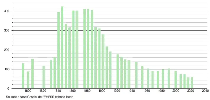 | L'évolution du nombre d'habitants est connue à travers les recensements de la population effectués dans la commune depuis 1793. Pour les communes de moins de 10 000 habitants, une enquête de recensement portant sur toute la population est réalisée tous les cinq ans, les populations légales des années intermédiaires étant quant à elles estimées par interpolation ou extrapolation[21]. Pour la commune, le premier recensement exhaustif entrant dans le cadre du nouveau dispositif a été réalisé en 2006[22]. En 2021, la commune comptait 58 habitants[Note 4], en diminution de 4,92 % par rapport à 2015 (Hautes-Pyrénées : +1,04 %, France hors Mayotte : +1,84 %). |