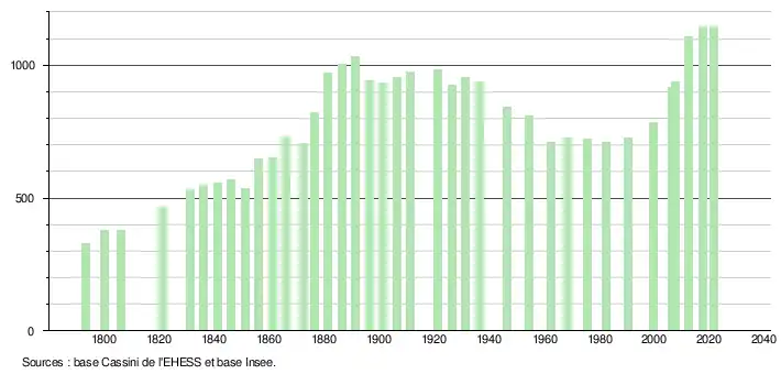 L'évolution du nombre d'habitants est connue à travers les recensements de la population effectués dans la commune depuis 1793. Pour les communes de moins de 10 000 habitants, une enquête de recensement portant sur toute la population est réalisée tous les cinq ans, les populations légales des années intermédiaires étant quant à elles estimées par interpolation ou extrapolation[28]. Pour la commune, le premier recensement exhaustif entrant dans le cadre du nouveau dispositif a été réalisé en 2007[29].