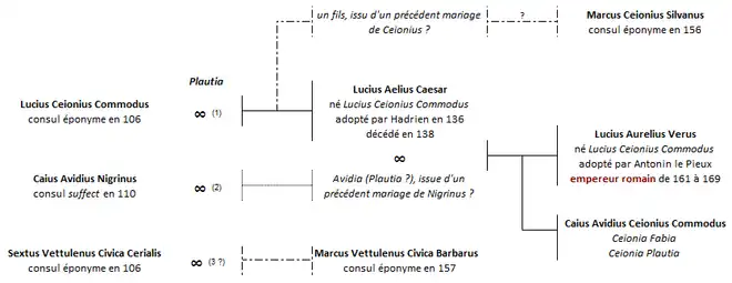 Son grand-père maternel est Caius Avidius Nigrinus, général de Trajan, consul suffect en 110 et mis à mort au début du règne d'Hadrien en 118. La famille des Avidii Nigrini est originaire de Faventia, en Émilie. On ignore si sa fille est issue d'un premier mariage ou d'un second mariage avec la veuve ou divorcée de Lucius Ceionius Commodus. De plus, cette Plautia qui a épousé successivement ses deux grands-pères, veuve en 118, épouse peut-être en troisièmes noces Sextus Vettulenus Civica Cerialis, et de cette union serait né Marcus Vettulenus Civica Barbarus, consul éponyme en 157 à la fin du règne d'Antonin le Pieux[1],[3].