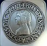 Reproduction en argent (1989) du testone que Ludovico avait frappé en 1497 avec sa propre effigie d’une part et de son épouse Béatrice d’autre part, immédiatement après sa mort. Un des premiers exemples de monnaie de ce type, témoignage d’un grand amour et d’admiration envers sa femme. | ||
