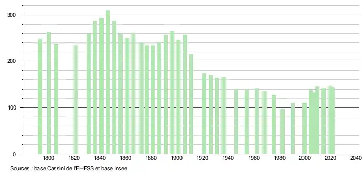 L'évolution du nombre d'habitants est connue à travers les recensements de la population effectués dans la commune depuis 1793. Pour les communes de moins de 10 000 habitants, une enquête de recensement portant sur toute la population est réalisée tous les cinq ans, les populations légales des années intermédiaires étant quant à elles estimées par interpolation ou extrapolation[25]. Pour la commune, le premier recensement exhaustif entrant dans le cadre du nouveau dispositif a été réalisé en 2004[26].