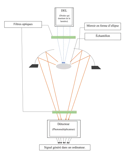 Pour la source de stimulation (lumière), une source DEL (Diode ÉlectroLuminescente) est souvent utilisée à une longueur d’onde de 470 nm ou 520 nm (soit les valeurs du spectre de la couleur bleu et vert)[9].