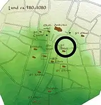 Lund a été dès sa fondation une ville chrétienne. Une église en bois a été datée du début des années 990, au niveau de la rue Kattesund, à l'emplacement du musée Drottens Kyrkoruin, justifiant l'époque présumée de la fondation de la ville[17]. Le Danemark faisait à cette époque, comme toute la Scandinavie, partie de l'archidiocèse de Hambourg-Brême, qui avait été chargé d'évangéliser la région[LM 8]. Cependant, le Danemark voyait d'un mauvais œil ceci, car il y voyait une menace contre son indépendance[LM 8]. Le roi Sven II de Danemark tenta en 1054 d'obtenir la création d'un archidiocèse du Danemark auprès du pape Léon IX[LM 9]. Bien que le pape n'était pas hostile à cette idée, l'archevêque Adalbert de Brême s'y opposa fermement et l'archidiocèse ne fut pas créé[LM 9]. En 1060, Sven II divisa les trois diocèses qui composait alors le Danemark (Fionie, Seeland et Scanie)[LM 10] en dix, de façon à mieux justifier la formation de l'archidiocèse[LM 9]. Lund devient alors un évêché, tout comme sa voisine Dalby[LM 10]. En 1085, au plus tard, fut consacré l'autel d'une première cathédrale à Lund[LM 11], à l'emplacement de l'actuelle[LM 12]. En cette même année fut fondée Katedralskolan[18], qui devint ainsi l'école la plus ancienne des pays nordiques. Le fait pour Lund de devenir un évêché signifia une croissance en importance de la ville comparée aux autres villes importantes de la région, comme Helsingborg ou Ystad[LM 13].
