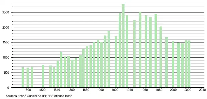 L'évolution du nombre d'habitants est connue à travers les recensements de la population effectués dans la commune depuis 1793. Pour les communes de moins de 10 000 habitants, une enquête de recensement portant sur toute la population est réalisée tous les cinq ans, les populations légales des années intermédiaires étant quant à elles estimées par interpolation ou extrapolation[29]. Pour la commune, le premier recensement exhaustif entrant dans le cadre du nouveau dispositif a été réalisé en 2007[30].