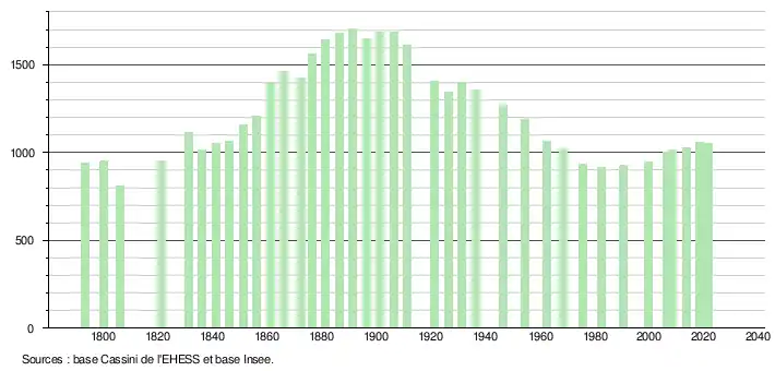 L'évolution du nombre d'habitants est connue à travers les recensements de la population effectués dans la commune depuis 1793. Pour les communes de moins de 10 000 habitants, une enquête de recensement portant sur toute la population est réalisée tous les cinq ans, les populations légales des années intermédiaires étant quant à elles estimées par interpolation ou extrapolation[19]. Pour la commune, le premier recensement exhaustif entrant dans le cadre du nouveau dispositif a été réalisé en 2008[20].