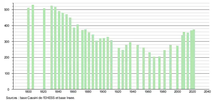 L'évolution du nombre d'habitants est connue à travers les recensements de la population effectués dans la commune depuis 1800. Pour les communes de moins de 10 000 habitants, une enquête de recensement portant sur toute la population est réalisée tous les cinq ans, les populations légales des années intermédiaires étant quant à elles estimées par interpolation ou extrapolation[22]. Pour la commune, le premier recensement exhaustif entrant dans le cadre du nouveau dispositif a été réalisé en 2008[23].