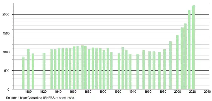 L'évolution du nombre d'habitants est connue à travers les recensements de la population effectués dans la commune depuis 1793. Pour les communes de moins de 10 000 habitants, une enquête de recensement portant sur toute la population est réalisée tous les cinq ans, les populations légales des années intermédiaires étant quant à elles estimées par interpolation ou extrapolation[24]. Pour la commune, le premier recensement exhaustif entrant dans le cadre du nouveau dispositif a été réalisé en 2005[25].
