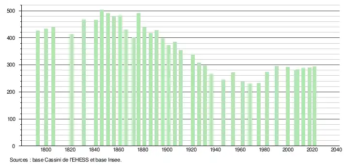 L'évolution du nombre d'habitants est connue à travers les recensements de la population effectués dans la commune depuis 1793. Pour les communes de moins de 10 000 habitants, une enquête de recensement portant sur toute la population est réalisée tous les cinq ans, les populations légales des années intermédiaires étant quant à elles estimées par interpolation ou extrapolation[29]. Pour la commune, le premier recensement exhaustif entrant dans le cadre du nouveau dispositif a été réalisé en 2007[30].