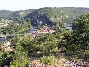 Le village historique, est située dans un isthme formé par le Lot, de 90 m de large (soit 300 pieds romains), bordée au nord par la colline de l'Impernal (150 m d'altitude), au sud par celle de la Pistoule (70 m d'altitude) que la rivière contourne d'une boucle, appelée cingle (méandre)[1].