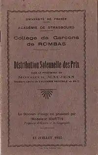 - (Sans auteur), Collège municipal de garçons de Rombas, fascicule imprimé (24p.) en 1938 par l'association des parents d'élèves