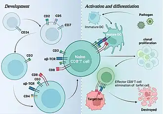 Les lymphocytes T CD8+ se développent à partir de cellules souches hématopoïétiques CD34+ situées dans la moelle osseuse, qui expriment CD2, CD5 et CD7 avant de quitter la moelle osseuse et d'entrer dans le thymus pour devenir des progéniteurs lymphoïdes exprimant CD3, et subissent ensuite un double négatif ( CD8-CD4-) et une phase double positive (CD8+ CD4+) pour finalement devenir des thymocytes CD8+ simples positifs. Ces cellules sont sélectionnées par des clones positifs et négatifs pour devenir des cellules CD8+ TCR-αβ et sont libérées dans la circulation[9],[10]. Les cellules présentatrices d'antigènes telles que les cellules dendritiques présentent généralement des peptides antigéniques endogènes par le complexe majeur d'histocompatibilité de classe I[11]. Les lymphocytes T CD8+ sont activés par la reconnaissance de peptides antigéniques par les co-récepteurs CD8+ sur les TCR et les lymphocytes T CD8+ et les lymphocytes T CD8+ activés peuvent conduire à une expansion clonale de lymphocytes T CD8+ spécifiques de l'antigène, qui se différencient ensuite en cellules effectrices ou mémoires[12].