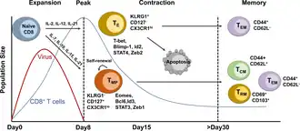La dynamique de la réponse des lymphocytes T CD8+ aux infections aiguës a été étudiée de manière approfondie La réponse des lymphocytes T CD8+ spécifiques à un antigène peut être grossièrement divisée en étapes distinctes : la phase d'expansion (0 à 7 jours) où les lymphocytes T CD8+ les cellules prolifèrent activement ; le pic d’expansion (jour 8) où les lymphocytes T effecteurs CD8+ atteignent le nombre maximum et cessent de proliférer ; la phase de contraction (8 à 15 jours) où la majorité des lymphocytes T effecteurs CD8+ subissent l'apoptose ; et la phase de mémoire (> 30 jours) avec seulement une petite population de cellules survivent et se différencient en types distincts de cellules mémoire : CD44+CD62L− pour les lymphocytes à mémoire effectrice, CD44+CD62L+ pour les lymphocytes à mémoire centrale et CD69+CD103+ TRM [20] pour les lymphocytes T à mémoire résidents dans les tissus[21],[22],[23].