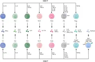 Au cours de la différenciation des lymphocytes T CD8+, des populations effectrices et mémoires hétérogènes ont été identifiées, notamment des lymphocytes T CD8+ effecteurs à courte durée de vie , des lymphocytes T CD8+ épuisés , des lymphocytes T CD8+ à mémoire longue , des précurseurs de mémoire CD8+ , les cellules T CD8+ à mémoire centrale et effectrice et les lymphocytes T à mémoire résidents dans les tissus , qui sont nommées en fonction de leur phénotype, de leur potentiel de différenciation et de leur fonctionnalité[18],[19].