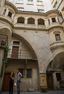 L'église Saint-Georges, quant à elle, surveille l'établissement des « hospitaliers de Saint-Jean de Jérusalem », qui a vocation a accueillir des pèlerins. Tout proche de l'église Sainte-Marie se trouve le petit hôpital du même nom. Ces deux établissements ne sont guère actifs. Enfin en 1474, Jacques Caille, riche marchand lyonnais, et sa femme Huguette Balarin, décident de fonder l'« hôpital Saint-Laurent »[N 17] pour les pestiférés et acquièrent du chapitre de Saint-Irénée la chapelle de Saint-Laurent des vignes ainsi que des terrains et bâtiments attenants, situés au-dessous de la paroisse Saint-Irénée. Une fois les aménagements réalisés, l'institution est confiée au consulat. Cette église devient rapidement trop petite et la confrérie de la Trinité l'agrandit à ses frais en 1509. En 1533, Thomas II de Gadagne, sous l'impulsion du dominicain Sante Pagnini demande à l'architecte Salvator Salvatori[11] de construire un troisième bâtiment[12],[au 1],[13].