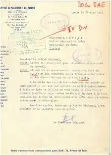 En , le pouvoir met progressivement en place de nouveaux organes correspondant à sa politique de Révolution nationale. Ce mois est donc créée la délégation régionale[N 7] à la famille[N 8], qui a pour charge dans un premier temps de faire des rapports auprès du secrétariat d'état à la famille et à la santé pour décrire la situation sur le terrain et proposer des mesures à prendre pour promouvoir la politique nataliste du régime[9]. Ils sont également chargés de veiller à l'application des lois qui concernent la famille et leur rôle, initialement technique, devient progressivement de plus en plus politique et il se doivent de faire fructifier l'esprit du nouveau régime. Le délégué nommé par Vichy est Georges de la Grandière[N 9], qui est secondé entre et l'été 1941 par Maurice Denis ; il reste en place jusqu'en . Le délégué surveille donc, entre autres, que les mères souffrent moins que le reste de la population des privations de guerre, qu'elles puissent avoir accès à tout ce que prévoient comme rations supplémentaires les autorités, et dénonce régulièrement la mauvaise volonté des commerçants et de la population[o 1].