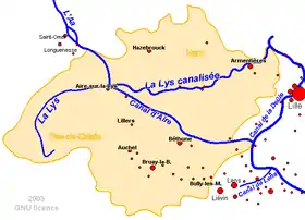 | Principales localités | Aire-sur-la-Lys, Armentières, Frelinghien Deûlémont, Comines-Warneton, Wervik, Menin, Courtrai, Deinze, Gand |