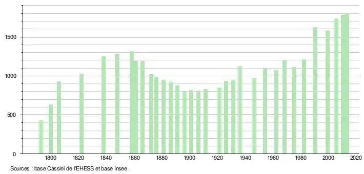 L'évolution du nombre d'habitants est connue à travers les recensements de la population effectués dans la commune depuis 1793. À partir du , les populations légales des communes sont publiées annuellement dans le cadre d'un recensement qui repose désormais sur une collecte d'information annuelle, concernant successivement tous les territoires communaux au cours d'une période de cinq ans. Pour les communes de moins de 10 000 habitants, une enquête de recensement portant sur toute la population est réalisée tous les cinq ans, les populations légales des années intermédiaires étant quant à elles estimées par interpolation ou extrapolation[3]. Pour la commune, le premier recensement exhaustif entrant dans le cadre du nouveau dispositif a été réalisé en 2005[4],[Note 1].