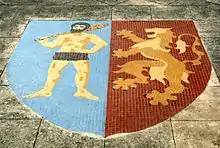 Blason | Parti : au premier d'azur au sauvage d'or, au second de gueules au lion d'or ; le tout sommé d'un chef d'or chargé de trois merlettes de sable[32]. |