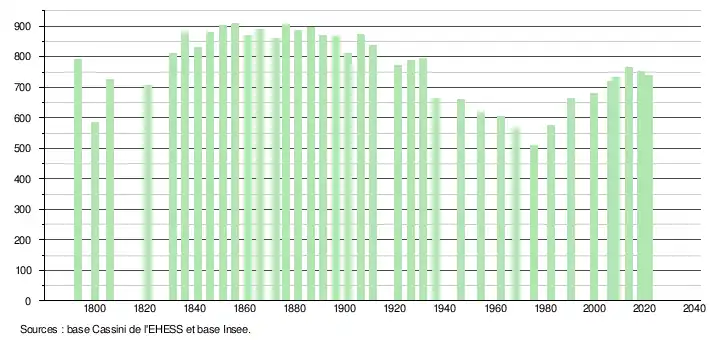 L'évolution du nombre d'habitants est connue à travers les recensements de la population effectués dans la commune depuis 1793. Pour les communes de moins de 10 000 habitants, une enquête de recensement portant sur toute la population est réalisée tous les cinq ans, les populations légales des années intermédiaires étant quant à elles estimées par interpolation ou extrapolation[34]. Pour la commune, le premier recensement exhaustif entrant dans le cadre du nouveau dispositif a été réalisé en 2008[35].