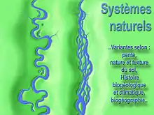 - L'organisation des successions végétales riveraines des cours d'eau en pays tempéré, comprend des associations différentes, depuis les pionniers jusqu'à la ripisylve constituée. « Les bancs alluviaux sont colonisés en premier par les espèces pionnières herbacées, caractérisées par un enracinement profond qui leur permet de résister aux étiages prolongés et par une bonne faculté de se régénérer par les graines que le courant transporte aisément. En second lieu apparaissent les espèces ligneuses pionnières, les saules tout particulièrement et le peuplier noir. Ensuite apparaissent les aulnes et enfin les espèces à bois dur, frêne, érables, hêtres. Dans les zones aval dépourvues de bancs alluviaux, ou dans les rives concaves, les pieds de berge sont occupés par le saule et le peuplier ainsi que par l'aulne glutineux lorsque les conditions d'humidité le permettent. Plus en hauteur sur la berge, viennent l'érable, le frêne, l'orme, le tilleul… Au sommet de la berge, viennent le charme et le chêne pédonculé ». Cf Gérard Degoutte, Diagnostic, aménagement et gestion des rivières, Lavoisier, , p. 97-98.