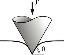 Lors du contact entre un cône rigide et un demi-espace élastique, la profondeur de l'enfoncement et le rayon de contact sont reliés par la relation suivante: