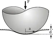 Une sphère élastique de rayon est enfoncée d'une profondeur dans un demi-espace élastique, ceci crée une zone de contact de rayon . La force nécessaire pour maintenir ce contact est égale à: