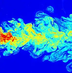 La turbulence est un phénomène étudié depuis Léonard de Vinci mais encore mal compris. Il n'existe pas de théorie permettant de décrire le phénomène à partir des équations de Navier-Stokes. La cascade turbulente se manifeste par un transfert d'énergie des grandes structures créées par les gradients de vitesse - encore le terme V ⋅ ∇V - vers les petits tourbillons détruits par dissipation visqueuse. Un résultat majeur obtenu par Kolmogorov est la description des échelles intermédiaires où se produit une diffusion de l'énergie cinétique par mélange et étirement/repli des tourbillons. Cette région possède une propriété d'auto-similitude : les transferts se produisent identiquement à toutes les échelles. Ce résultat illustre la capacité explicative de l'approche physique statistique et systèmes dynamiques.
