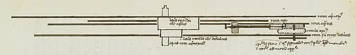 Pour gagner en longueur sur la course du filin, il était bien sûr possible d'augmenter la fréquence du remontage ou « d'utiliser une poulie réduisant la trajectoire du poids par moitié, mais exigeant [parfois] la présence d'un second poids »[1] ; le poids moteur doit alors être multiplié par deux pour obtenir le même effet.