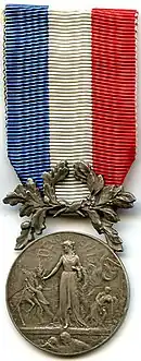 - Ruban : C'est un ruban tricolore bleu, blanc et rouge de 30 mm dont les bandes sont verticales et égales de 10 mm, avec une rosette tricolore de 20 mm sur la médaille d’or.