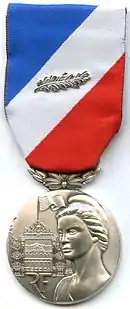 Le ruban de la médaille est agrémenté d'une palme pour l'échelon argent et d'une couronne de laurier pour l'échelon or.