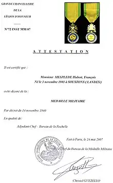 - Article R140 du Code de la Légion d'honneur, de la Médaille militaire et de l'ordre national du Mérite.