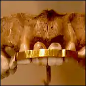 - Voir la prothèse étrusque sur bande en or avec dent de veau incorporée datant du IVe siècle av. J.-C. d'une tombe de la nécropole de Monterozzi, et l'appareil dentaire issu de Poggio Gaiella (Chiusi) conservé au musée archéologique de Florence